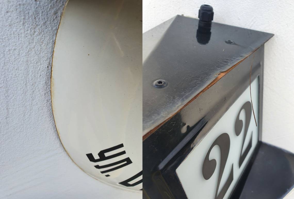 На фото указатель из обычной стали, который был размещён в приморском районе. Спустя время на нём появилась ржавчина, краска начала отслаиваться.