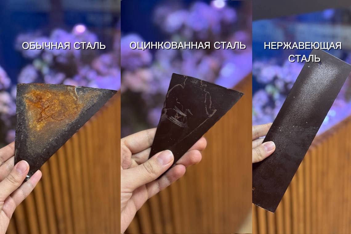 На 30 дней погрузили три варианта стали в солёную воду. Это были таблички из обычной, оцинкованной и нержавеющей стали. Самый главный вопрос — какая сталь выдержит воздействие морской среды?